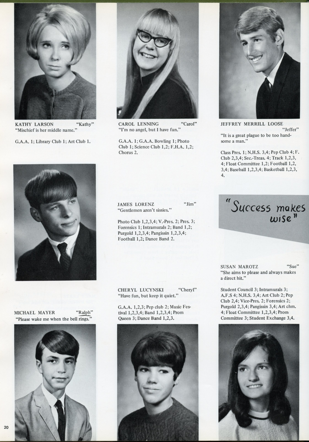 1969 Sheboygan Falls High School, Page 20: Kathy Larson, Carol Lenning, Jeffrey Merrill Loose, James Lorenz, Michael Mayer, Cheryl Lucynski, Susan Marotz.
