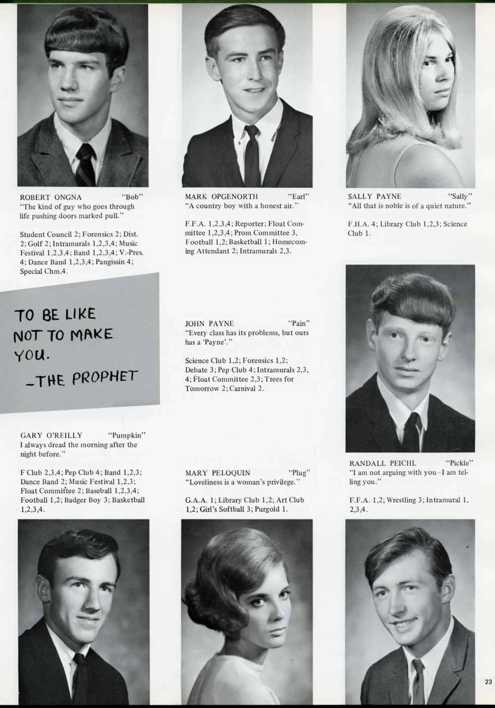 1969 Sheboygan Falls High School, Page 23: Robert Ongna, Mark Opgenorth, Sally Payne, John Payne, Gary O'Reilly, Mary Peloquin, Randall Peichl.