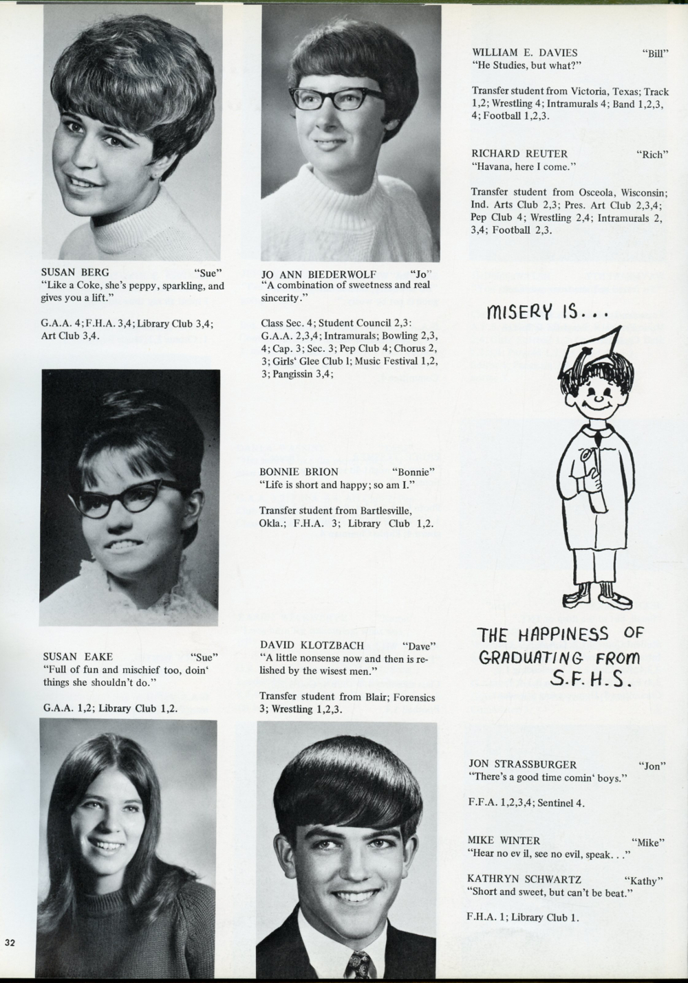 1969 Sheboygan Falls High School, Page 32: Susan Berg, Jo Ann Beiderwolf, William E. Davies, Richard Reuter, Susan Eake, Bonnie Brion, David Klotzbach, Jon Strassburger, Mike Winter, Kathryn Schwartz.
