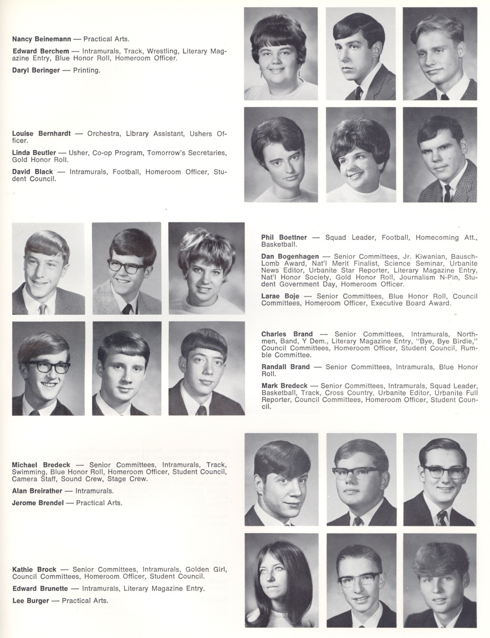 1969 Sheboygan North High School, Page 105: Nancy Beinemann, Edward Berchem, Daryl Beringer, Louise Bernhardt, Linda Beutler, David Black, Phil Boettner, Dan Bogenhagen, Larae Boje, Charles Brand, Randall Brand, Mark Bredeck, Michael Bredeck, Alan Breirather, Jerome Brendel, Kathie Brock, Edward Brunette, Lee Burger.