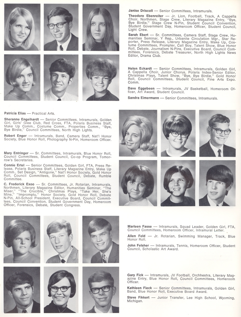 1969 Sheboygan North High School, Page 108: Janice Driscoll, Theodore Ebenreiter, Sarah Ebert, Helen Eckardt, Dave Eggebeen, Sandra Eimermann, Patricia Elias, Sheranne Engelhardt, Robert Enger, Mary Entringer, Connie Ertel, C. Frederick Exoo, Marleen Fasse, Allen Feld, John Felsher, Gary Fick, Kathleen Fieck, Steve Fikkert.