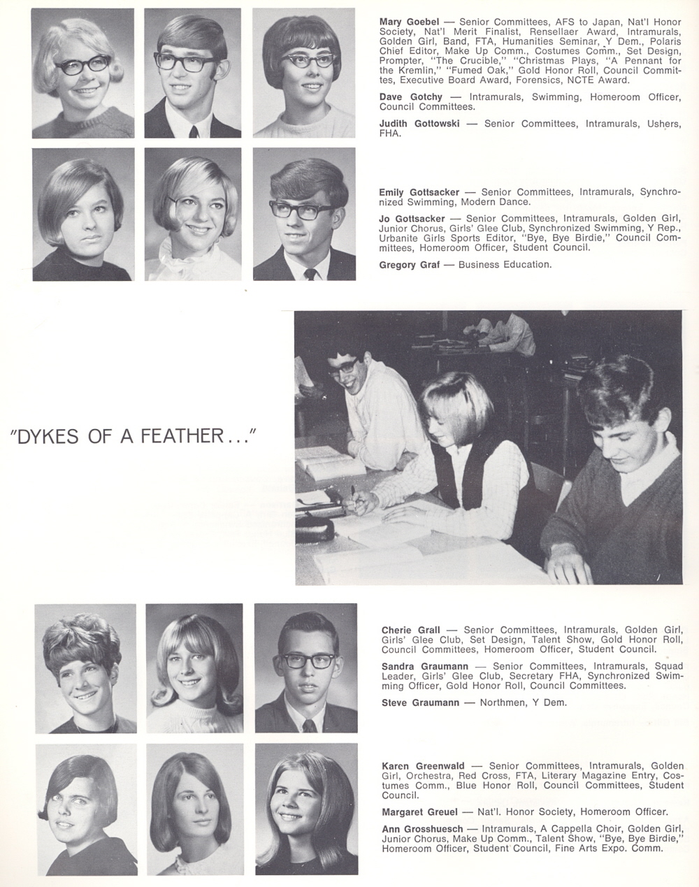 1969 Sheboygan North High School, Page 110: Mary Goebel, Dave Gotchy, Judith Gottowski, Emily Gottsacker, Jo Gottsacker, Gregory Graf, Cherie Grall, Sandra Graumann, Steve Graumann, Karen Greenwald, Margaret Greuel, Ann Grosshuesch.