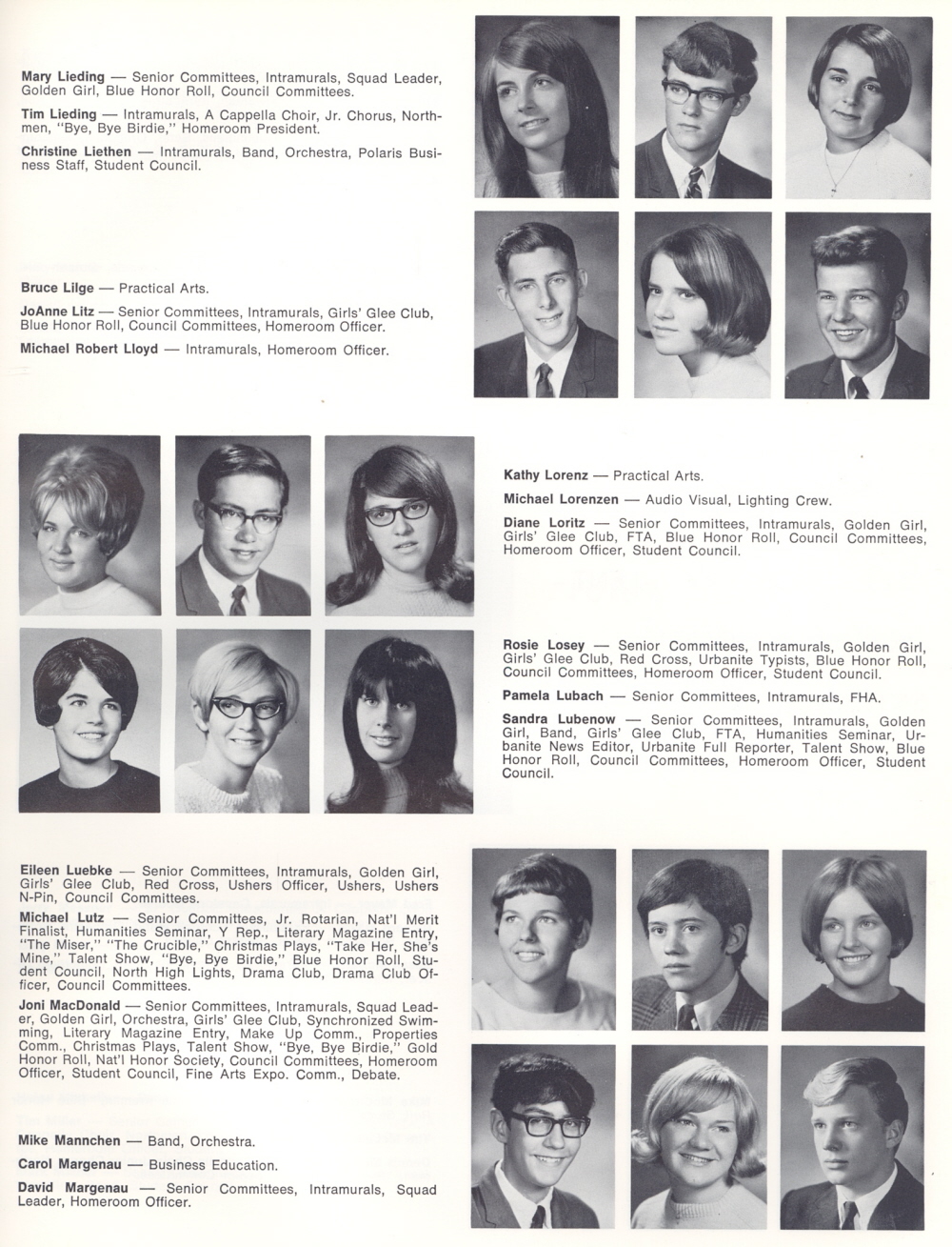 1969 Sheboygan North High School, Page 117: Mary Lieding, Tim Lieding, Christine Liethen, Bruce Lilge, JoAnne Litz, Michael Robert Lloyd, Kathy Lorenz, Michael Lorenzen, Diane Loritz, Rosie Losey, Pamela Lubach, Sandra Lubenow, Eileen Luebke, Michael Lutz, Joni MacDonald, Mike Mannchen, Carol Margenau, David Margenau.