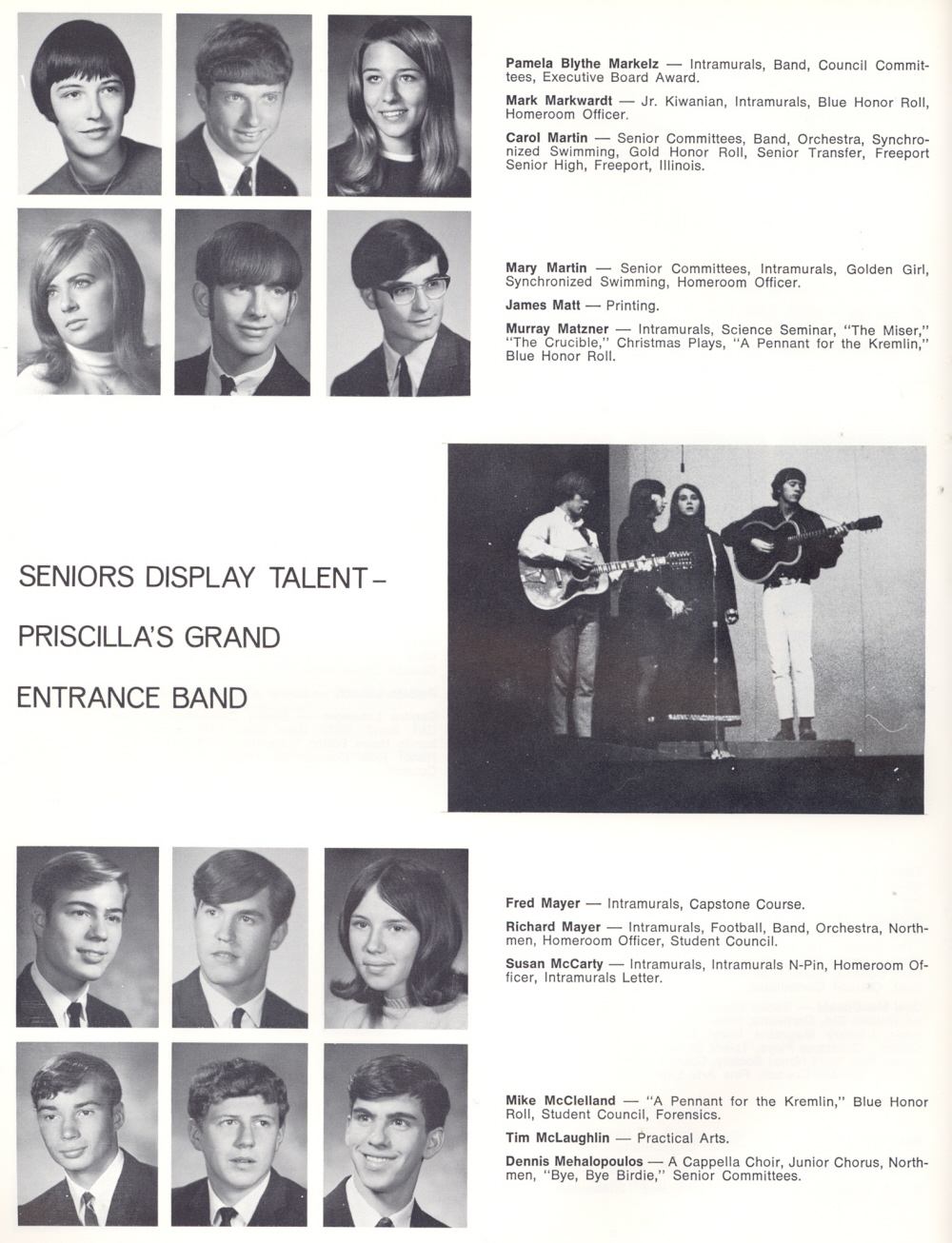 1969 Sheboygan North High School, Page 118: Pamela Blythe Markelz, Mark Markwardt, Carol Martin, Mary Martin, James Matt, Murray Matzner, Fred Mayer, Richard Mayer, Susan McCarty, Mike McClelland, Tim McLaughlin, Dennis Mehalopoulos.