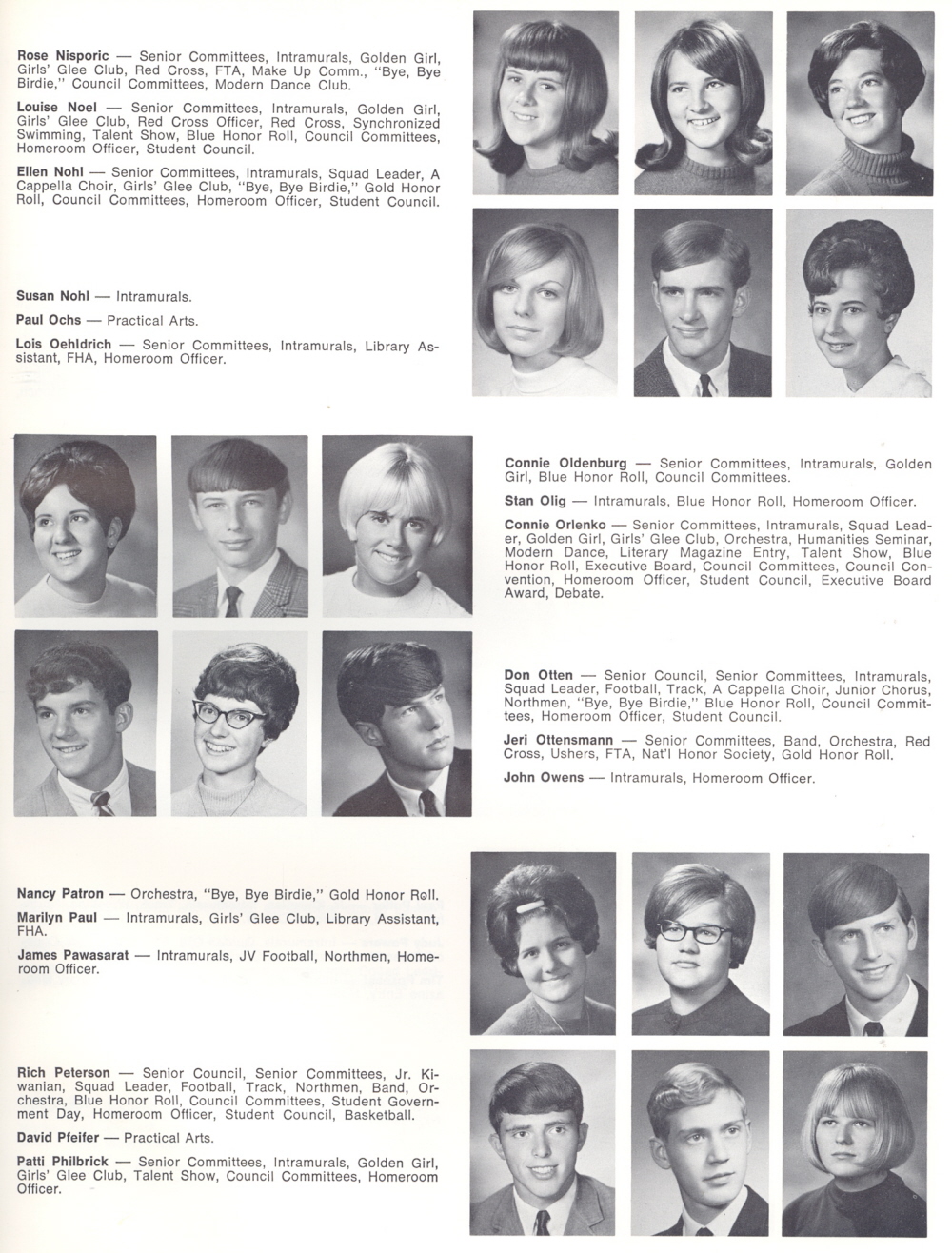 1969 Sheboygan North High School, Page 121: Rose Nisporic, Louise Noel, Ellen Nohl, Susan Nohl, Paul Ochs, Lois Oehldrich, Connie Oldenburg, Stan Olig, Connie Orlenko, Don Otten, Jeri Ottensmann, John Owens, Nancy Patron, Marilyn Paul, James Pawasarat, Rich Peterson, David Pfeifer, Patti Philbrick.