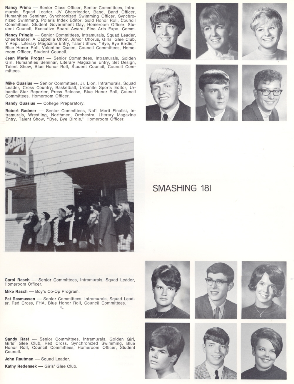 1969 Sheboygan North High School, Page 123: Nancy Primc, Nancy Pringle, Jean Marie Progar, Mike Quasius, Randy Quasius, Robert Radmer, Carol Rasch, Mike Rasch, Pat Rasmussen, Sandy Rast, John Rautman, Kathy Redensek.