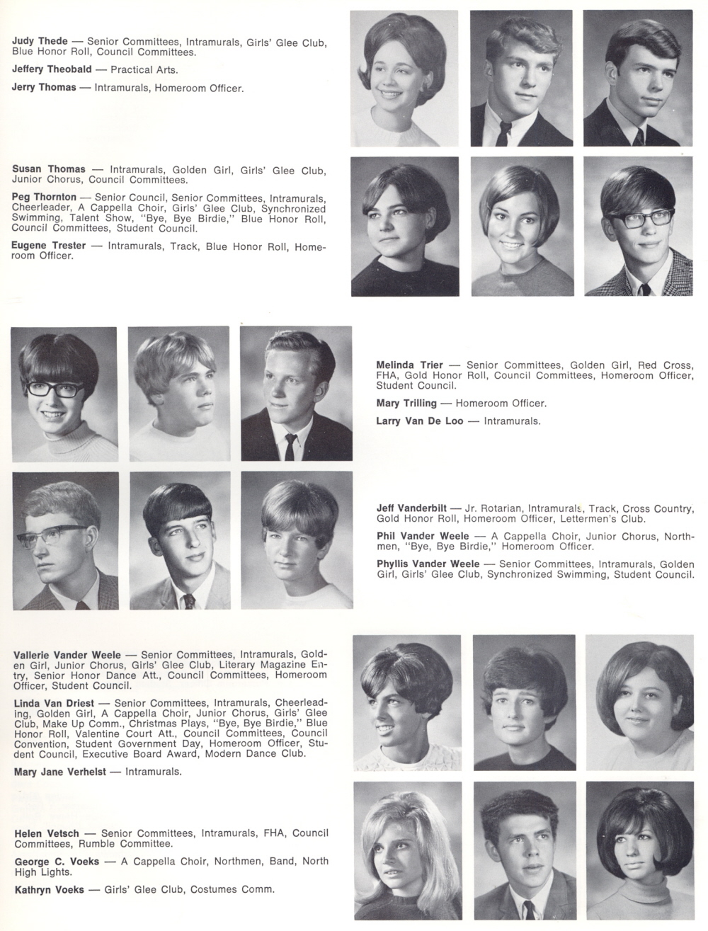 1969 Sheboygan North High School, Page 129: Judy Thede, Jeffery Theobald, Jerry Thomas, Susan Thomas, Peg Thornton, Eugene Trester, Melinda Trier, Mary Trilling, Larry Van De Loo, Jeff Vanderbilt, Phil Vander Weele, Vallerie Vander Weele, Linda Van Driest, Mary Jane Verhelst, Helen Vetsch, George C. Voeks, Kathryn Voeks.