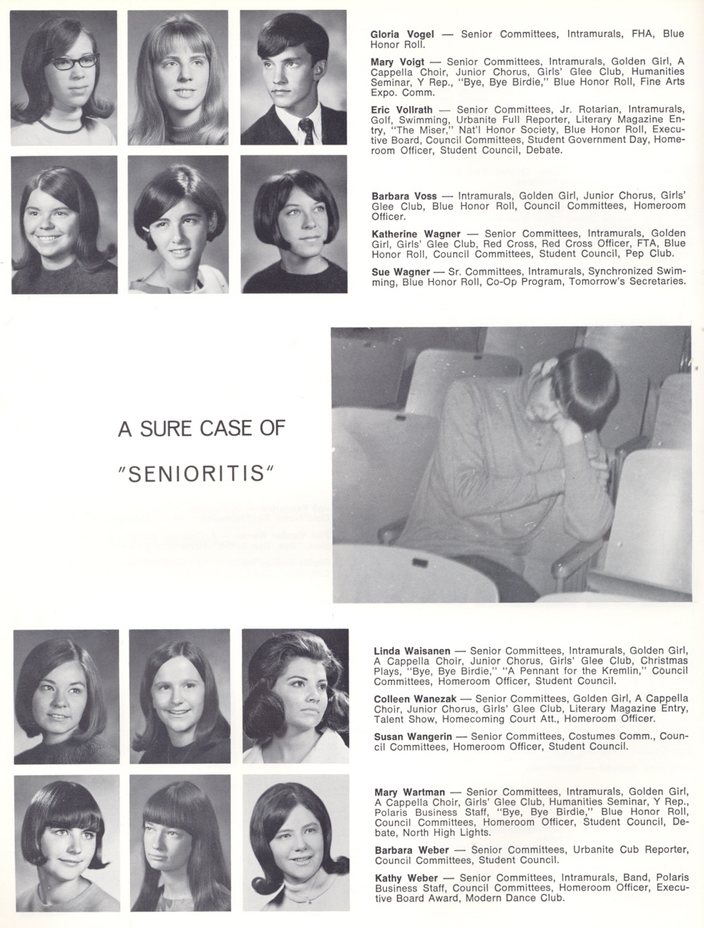 1969 Sheboygan North High School, Page 130: Gloria Vogel, Mary Voigt, Eric Vollrath, Barbara Voss, Katherine Wagner, Sue Wagner, Linda Waisanen, Colleen Wanezak, Susan Wangerin, Mary Wartman, Barbara Weber, Kathy Weber.