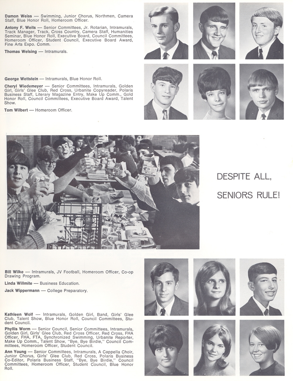 1969 Sheboygan North High School, Page 131: Damon Weiss, Antony F. Weits, Thomas Weising, George Wettstein, Cheryl Wiedemeyer, Tom Wilbert, Bill Wilke, Linda Willmite, Jack Wippermann, Kathleen Wolf, Phyllis Worm, Ann Young.