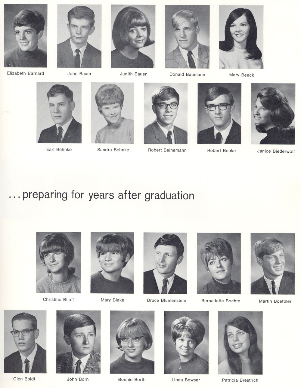 1969 Sheboygan South High School, Page 115: Elizabeth Barnard, John Bauer, Judith Bauer, Donald Baumann, Mary Beeck, Earl Behnke, Sandra Behnke, Robert Beinemann, Robert Benke, Janice Biederwolf, Christine Biloff, Mary Blake, Bruce Blumenstein, Bernadette Bochte, Martin Boettner, Glen Boldt, John Born, Bonnie Borth, Linda Bowser, Patricia Brestrich.