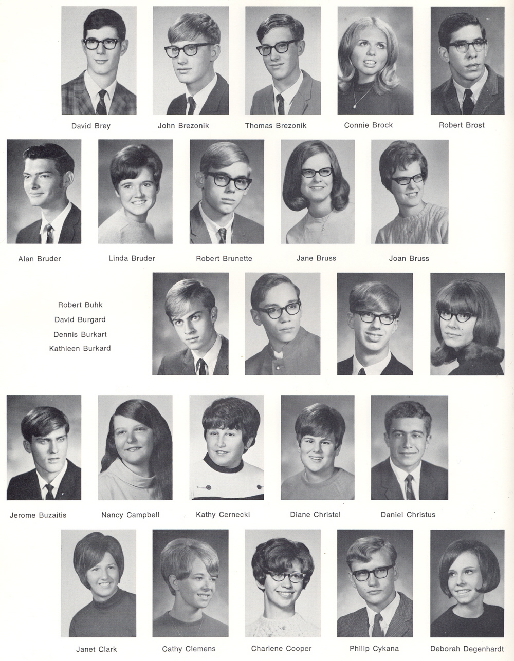 1969 Sheboygan South High School, Page 116: David Brey, John Brezonik, Thomas Brezonik, Connie Brock, Robert Brost, Alan Bruder, Linda Bruder, Robert Brunette, Jane Bruss, Joan Bruss, Robert Buhk, David Burgard, Dennis Burkart, Kathleen Burkard, Jerome Buzaitis, Nancy Campbell, Kathy Cernecki, Diane Christel, Daniel Christus, Janet Clark, Cathy Clemens, Charlene Cooper, Philip Cykana, Deborah Degenhardt.
