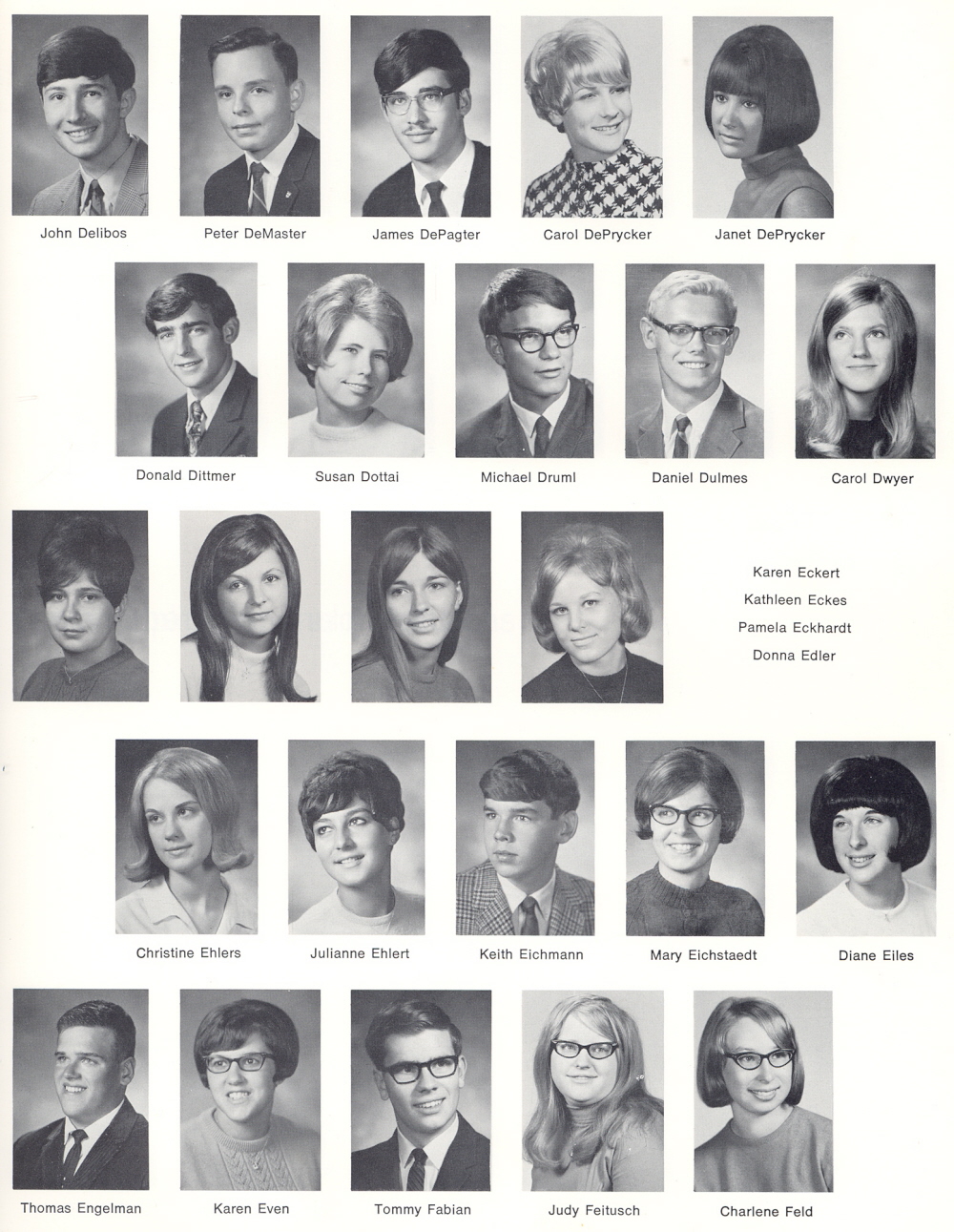1969 Sheboygan South High School, Page 117: John Delibos, Peter DeMaster, James DePagter, Carol DePrycker, Janet DePrycker, Donald Dittmer, Susan Dottai, Michael Druml, Daniel Dulmes, Carol Dwyer, Karen Eckert, Kathleen Eckes, Pamela Eckhardt, Donna Edler, Christine Ehlers, Julianne Ehlert, Keith Eichmann, Mary Eichstaedt, Diane Eiles, Thomas Engelman, Karen Even, Tommy Fabian, Judy Feitusch, Charlene Feld.