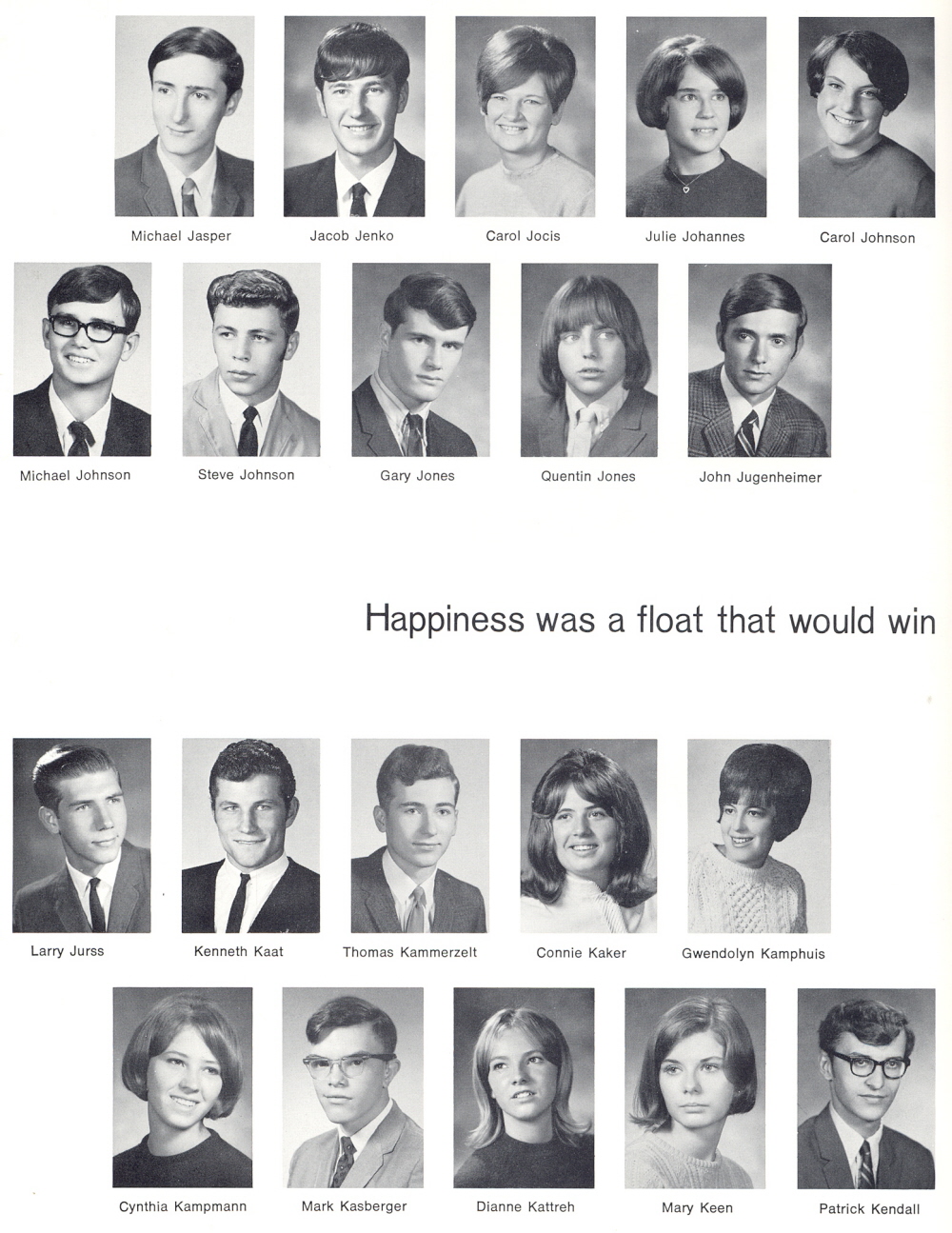 1969 Sheboygan South High School, Page 122: Michael Jasper, Jacob Jenko, Carol Jocis, Julie Johannes, Carol Johnson, Michael Johnson, Steve Johnson, Gary Jones, Quentin Jones, John Jugenheimer, Larry Jurss, Kenneth Kaat, Thomas Kammerzelt, Connie Kaker, Gwendolyn Kamphuis, Cynthia Kampmann, Mark Kasberger, Dianne Kattreh, Mary Keen, Patrick Kendall.