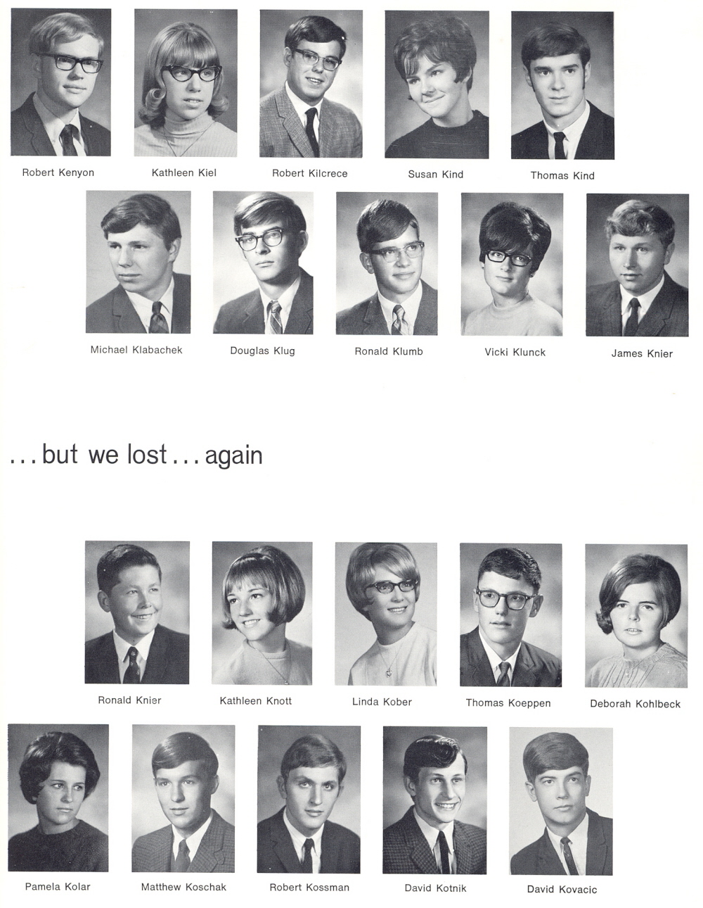 1969 Sheboygan South High School, Page 123: Robert Kenyon, Kathleen Kiel, Robert Kilcrece, Susan Kind, Thomas Kind, Michael Klabachek, Douglas Klug, Ronald Klumb, Vicki Klunck, James Knier, Ronald Knier, Kathleen Knott, Linda Kober, Thomas Koeppen, Deborah Kohlbeck, Pamela Kolar, Matthew Koschak, Robert Kossman, David Kotnik, David Kovacic.
