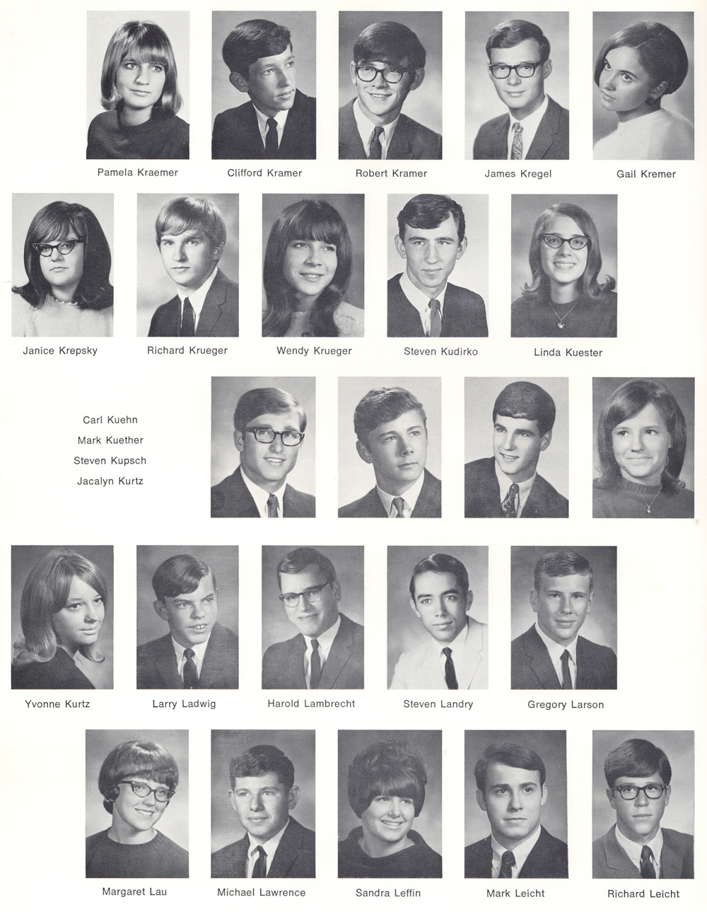 1969 Sheboygan South High School, Page 124: Pamela Kraemer, Clifford Kramer, Robert Kramer, James Kregel, Gail Kremer, Janice Krepsky, Richard Krueger, Wendy Krueger, Steven Kudirko, Linda Kuester, Carl Kuehn, Mark Kuether, Steven Kupsch, Jacalyn Kurtz, Yvonne Kurtz, Larry Ladwig, Harold Lambrecht, Steven Landry, Gregory Larson, Margaret Lau, Michael Lawrence, Sandra Leffin, Mark Leicht, Richard Leicht.