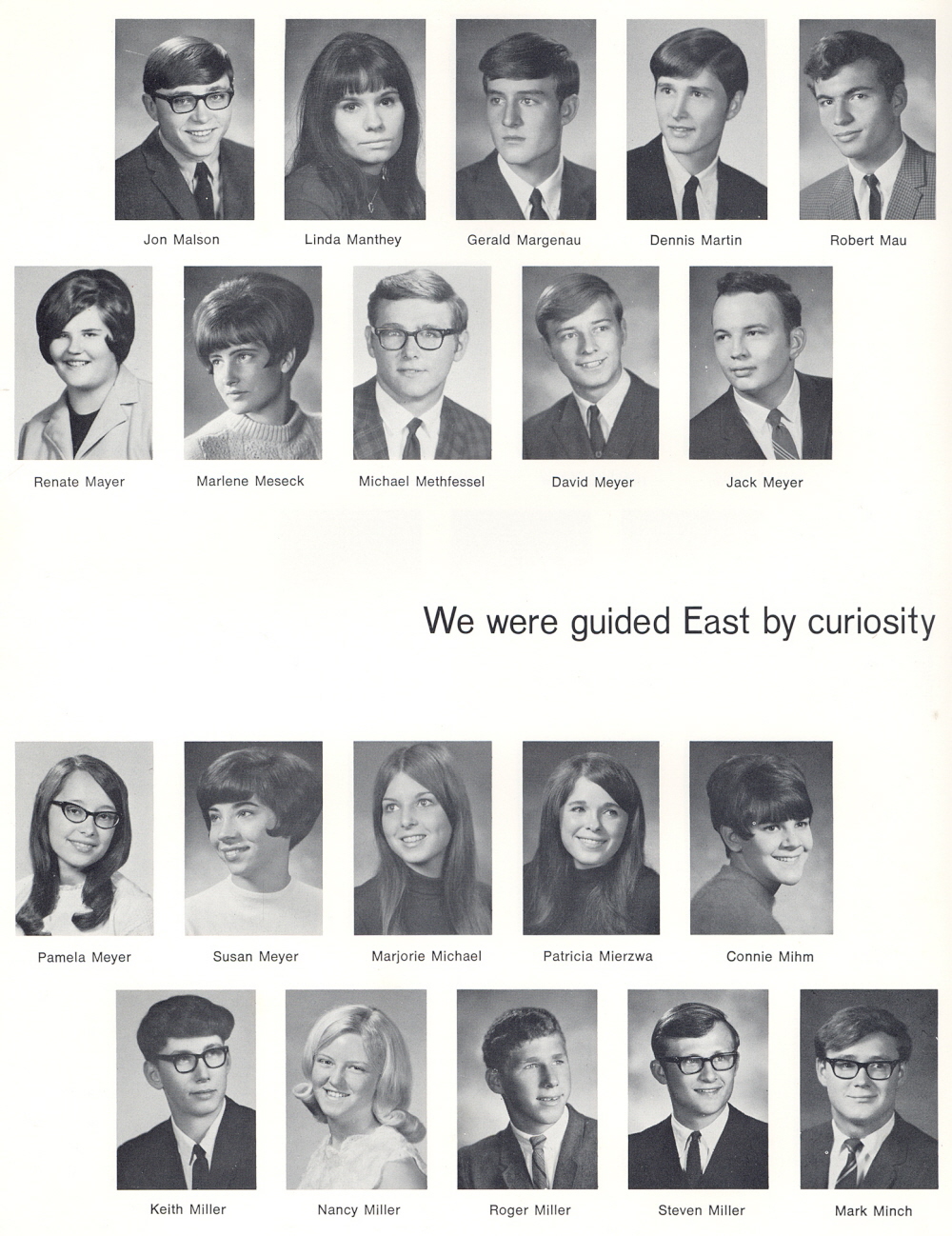1969 Sheboygan South High School, Page 126: Jon Malson, Linda Manthey, Gerald Margenau, Dennis Martin, Robert Mau, Renate Mayer, Marlene Meseck, Michael Methfessel, David Meyer, Jack Meyer, Pamela Meyer, Susan Meyer, Marjorie Michael, Patricia Mierzwa, Connie Mihm, Keith Miller, Nancy Miller, Roger Miller, Steven Miller, Mark Minch.