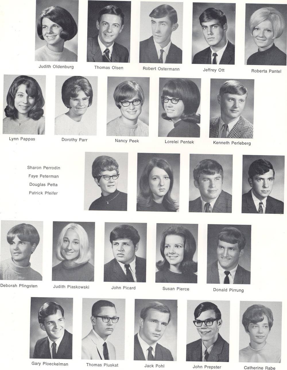 1969 Sheboygan South High School, Page 128: Judith Oldenburg, Thomas Olsen, Robert Ostermann, Jeffrey Ott, Roberta Pantel, Lynn Pappas, Dorothy Parr, Nancy Peek, Lorelei Pentek, Kenneth Perleberg, Sharon Perrodin, Faye Peterman, Douglas Petta, Patrick Pfeifer, Deborah Pfingsten, Judith Piaskowski, John Picard, Susan Pierce, Donald Pirrung, Gary Ploeckelman, Thomas Pluskat, Jack Pohl, John Prepster, Catherine Rabe.