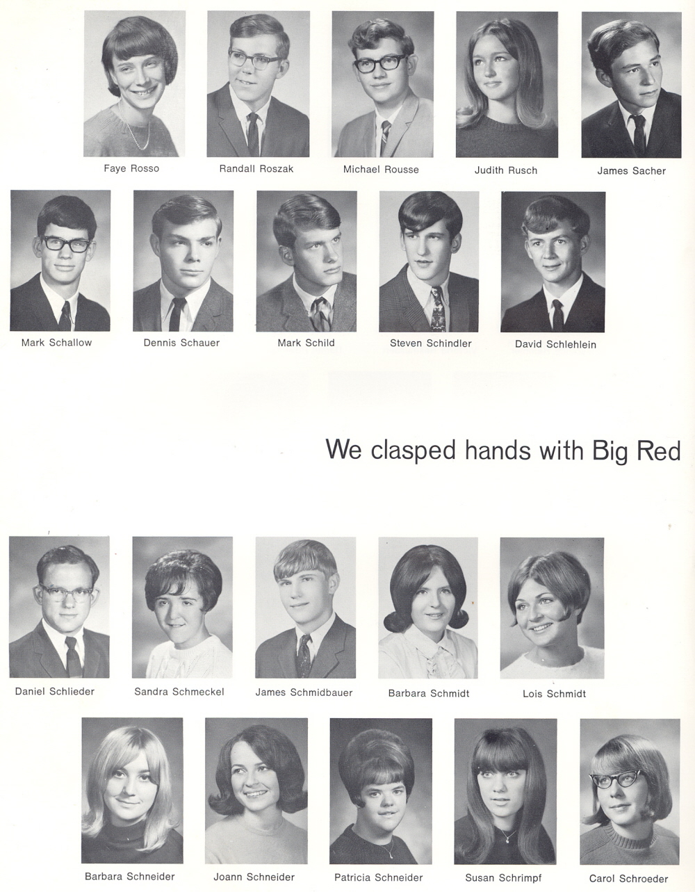 1969 Sheboygan South High School, Page 130: Faye Rosso, Randall Roszak, Michael Rousse, Judith Rusch, James Sacher, Mark Schallow, Dennis Schauer, Mark Schild, Steven Schindler, David Schlehlein, Daniel Schlieder, Sandra Schmeckel, James Schmidbauer, Barbara Schmidt, Lois Schmidt, Barbara Schneider, Joann Schneider, Patricia Schneider, Susan Schrimpf, Carol Schroeder.