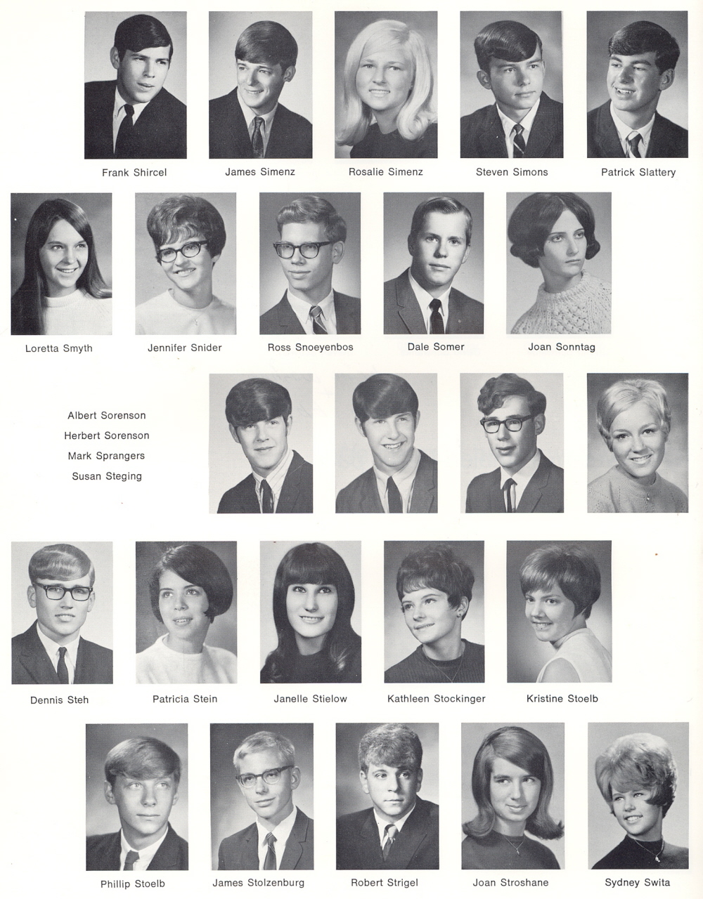 1969 Sheboygan South High School, Page 132: Frank Shircel, James Simenz, Rosalie Simenz, Steven Simons, Patrick Slattery, Loretta Smyth, Jennifer Snider, Ross Snoeyenbos, Dale Somer, Joan Sonntag, Albert Sorenson, Herbert Sorenson, Mark Sprangers, Susan Steging, Dennis Steh, Patricia Stein, Janelle Stielow, Kathleen Stockinger, Kristine Stoelb, Phillip Stoelb, James Stolzenburg, Robert Strigel, Joan Stroshane, Sydney Swita.