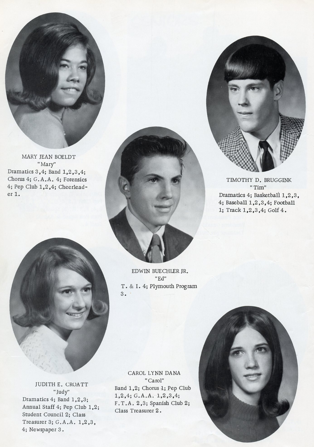 1970 Cedar Grove High School, Page 20: Mary Jean Boeldt, Timothy D. Bruggink, Edwin Buechler Jr., Judith Croatt, Carol Lynn Dana.