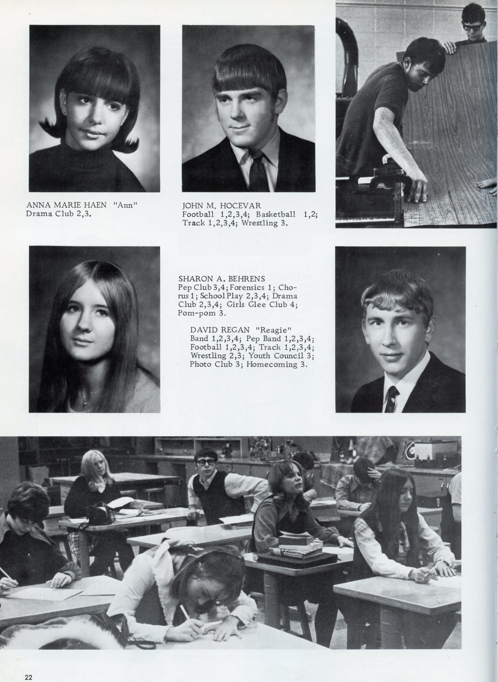1970 Kohler High School Yearbook Page 22: Anna Marie Haen, John M. Hocevar, Sharon A. Behrens, David Regan.
