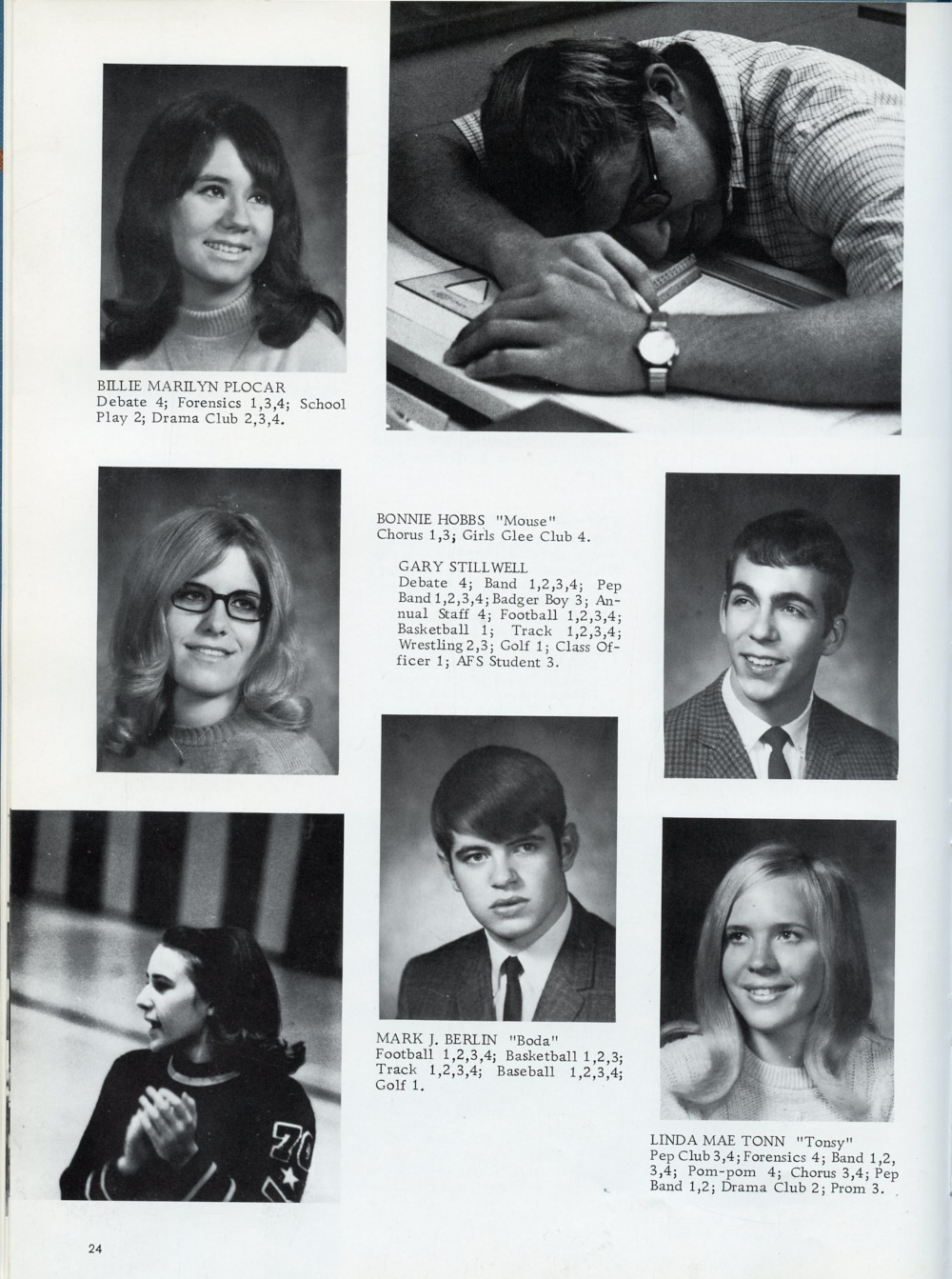 1970 Kohler High School Yearbook Page 24: Billie Marilyn Plocar, Bonnie Hobbs, Gary Stillwell, Mark J. Berlin, Linda Mae Tonn.