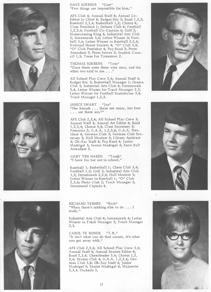 1970 Oostburg High School, Page 17: Dave Soerens, Thomas Soerens, Janice Swart, Gary Ten Haken, Richard Ternes, Carol Te Ronde.