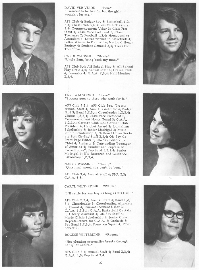1970 Oostburg High School, Page 20: David Ver Velde, Carol Wagner, Faye Walvoord, Nancy Wassink, Carol Wilterdink, Rogene Wilterdink.
