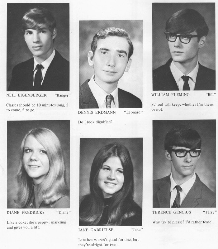 1970 Sheboygan Falls High School, Pages 118 and 133: Neil Eigenberger, Dennis Erdmann, William Fleming, Diane Fredricks, Jane Gabrielse, Terence Gencius.