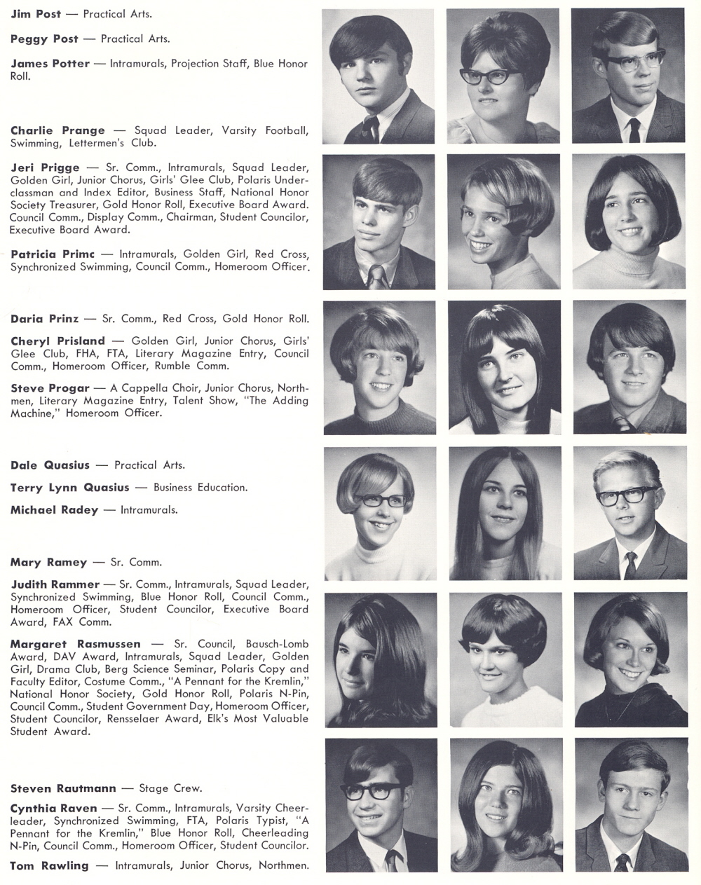 High School, Page 100: Jim Post, Peggy Post, James Potter, Charlie Prange, Jeri Prigge, Patricia Primc, Daria Prinz, Cheryl Prisland, Steve Progar, Dale Quasius, Terry Lynn Quasius, Michael Radey, Mary Ramey, Judith Rammer, Margaret Rasmussen, Steven Rautmann, Cynthia Raven, Tom Rawling.