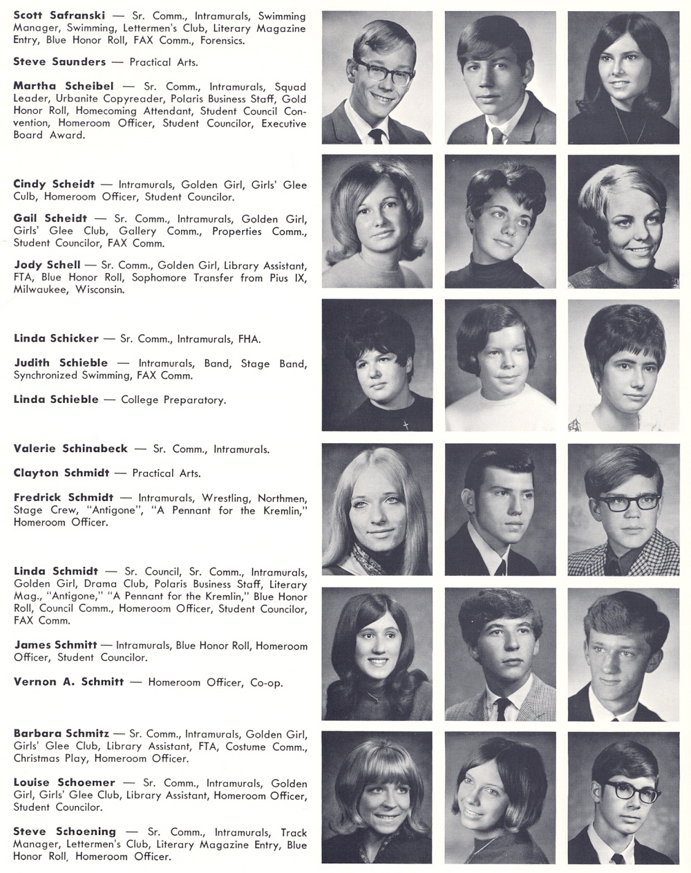 High School, Page 102: Scott Safranski, Steve Saunders, Martha Scheibel, Cindy Scheidt, Gail Scheidt, Jody Schell, Linda Schicker, Judith Schieble, Linda Schieble, Valerie Schinabeck, Clayton Schmidt, Fredrick Schmidt, Linda Schmidt, James Schmitt, Vernon A. Schmitt, Barbara Schmitz, Louise Schoemer, Steve Schoening.