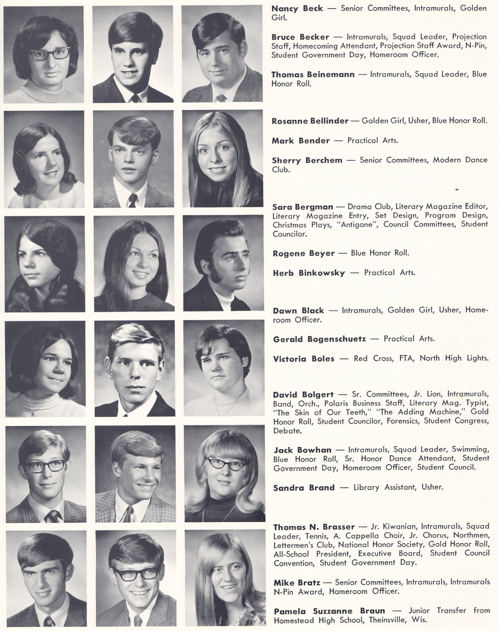 High School, Page 85: Nancy Beck, Bruce Becker, Thomas Beinemann, Rosanne Bellinder, Mark Bender, Sherry Berchem, Sara Bergman, Rogene Beyer, Herb Binkowsky, Dawn Black, Gerald Bogenschuetz, Victoria Boles, David Bolgert, Jack Bowhan, Sandra Brand, Thomas N. Brasser, Mike Bratz, Pamela Suzzanne Braun.