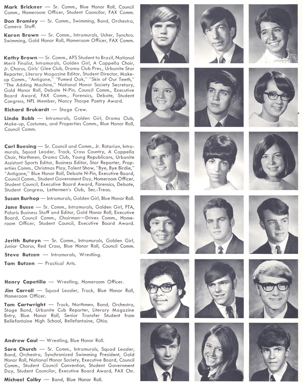 High School, Page 86: Mark Brickner, Don Bromley, Karen Brown, Kathy Brown, Richard Brukardt, Linda Bubb, Carl Buesing, Susan Burhop, Jane Busse, Jerith Buteyn, Steve Butzen, Tom Butzen, Henry Capetillo, Jim Carroll, Tom Cartwright, Andrew Caul, Sara Church, Michael Colby.