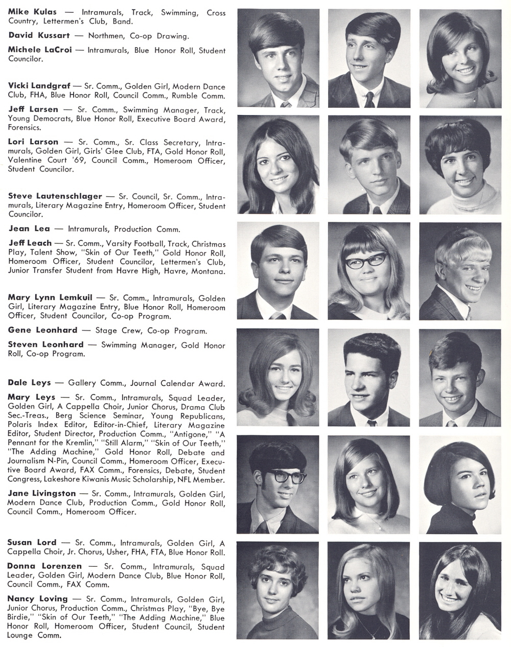 High School, Page 96: Mike Kulas, David Kussart, Michele LaCroi, Vicki Landgraf, Jeff Larsen, Lori Larson, Steve Lautenschlager, Jean Lea, Jeff Leach, Mary Lynn Lemkuil, Gene Leonhard, Steven Leonhard, Dale Leys, Mary Leys, Jane Livingston, Susan Lord, Donna Lorenzen, Nancy Loving.