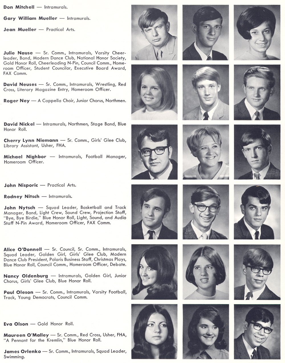 High School, Page 98: Don Mitchell, Gary William Mueller, Jean Mueller, Julie Nause, David Neuses, Roger Ney, David Nickel, Cherry Lynn Niemann, Michael Nighbor, John Nisporic, Rodney Nitsch, John Nytsch, Alice O'Donnell, Nancy Oldenburg, Paul Oleson, Eva Olson, Maureen O'Malley, James Orlenko.