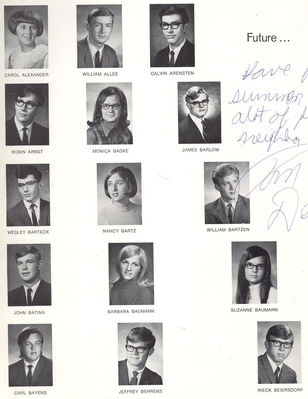 High School, Page 30: Carol Alexander, William Allee, Calvin Arentsen, Robin Arnst, Monica Badtke, James Barlow, Wesley Barteck, Nancy Bartz, William Bartzen, John Batina, Barbara Baumann, Suzanne Baumann, Carl Bayens, Jeffrey Behrens, Rieck Beiersdorf.