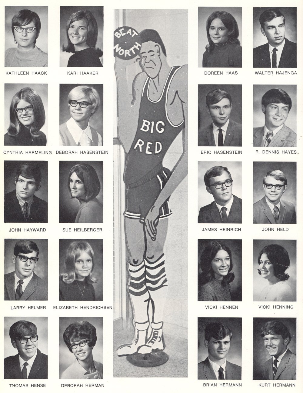 High School, Page 38: Kathleen Haack, Kari Haaker, Doreen Haas, Walter Hajenga, Cynthia Harmeling, Deborah Hasenstein, Eric Hasenstein, R. Dennis Hayes, John Hayward, Sue Hielberger, James Heinrich, John Held, Larry Helmer, Elizabeth Hendrichsen, Vicki Hennen, Vicki Henning, Thomas Hense, Deborah Herman, Brian Hermann, Kurt Hermann.