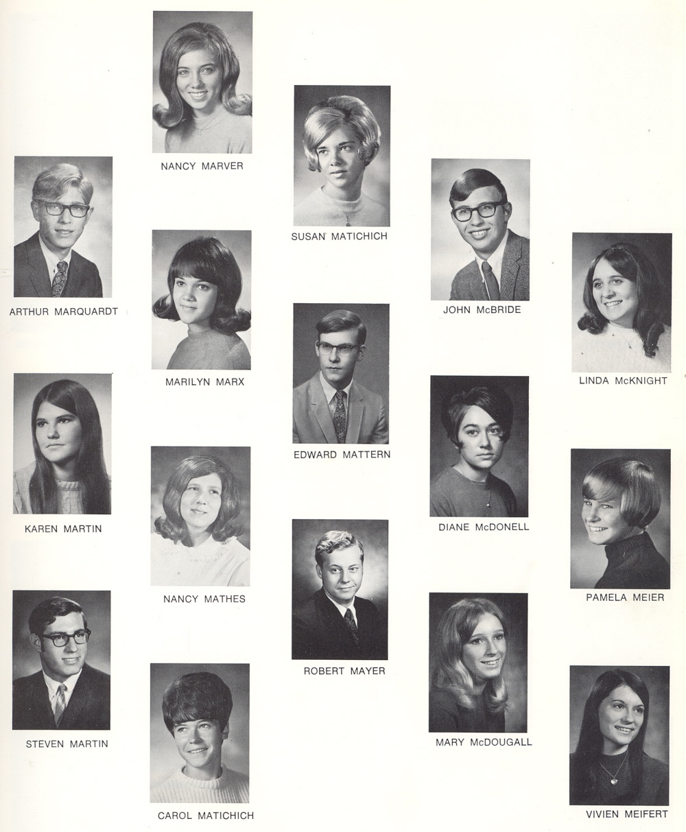 High School, Page 45: Arthur Marquardt, Karen Martin, Steven Martin, Nancy Marver, Marilyn Marx, Nancy Mathes, Carol Matichich, Susan Matichich, Edward Mattern, Robert Mayer, John McBride, Diane McDonell, Mary McDougall, Linda McKnight, Pamela Meier, Vivien Meifert.
