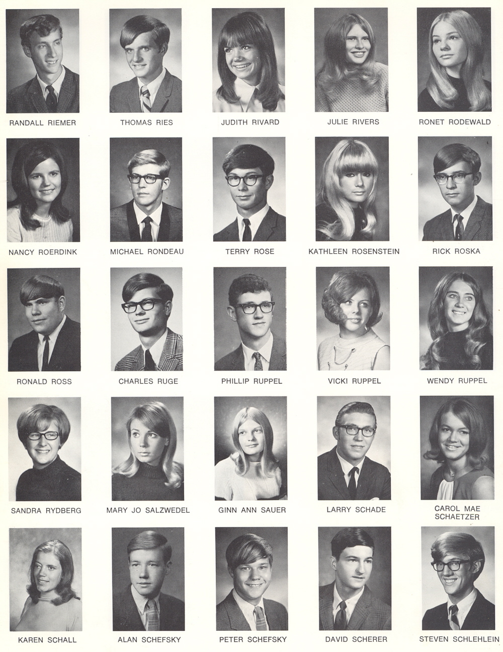 High School, Page 50: Randall Riemer, Thomas Ries, Judith Rivard, Julie Rivers, Ronet Rodewald, Nancy Roerdink, Michael Rondeau, Terry Rose, Kathleen Rosenstein, Rick Roska, Ronald Ross, Charles Ruge, Phillip Ruppel, Vicki Ruppel, Wendy Ruppel, Sandra Rydberg, Mary Jo Salzwedel, Ginn Ann Sauer, Larry Schade, Carol Mae Schaetzer, Karen Schall, Alan Schefsky, Peter Schefsky, David Scherer, Steven Schlehlein.