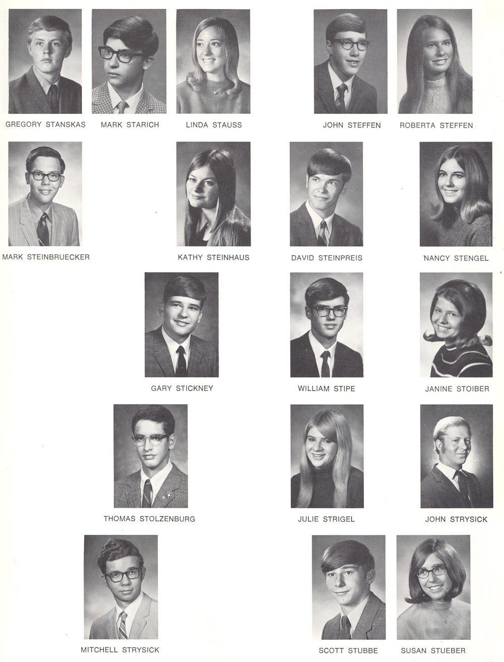 High School, Page 53: Gregory Stanskas, Mark Starich, Linda Stauss, John Steffen, Roberta Steffen, Mark Steinbruecker, Kathy Steinhaus, David Steinpreis, Nancy Stengel, Gary Stickney, William Stipe, Janine Stoiber, Thomas Stolzenburg, Julie Strigel, John Strysick, Mitchell Strysick, Scott Stubbe, Susan Stueber.