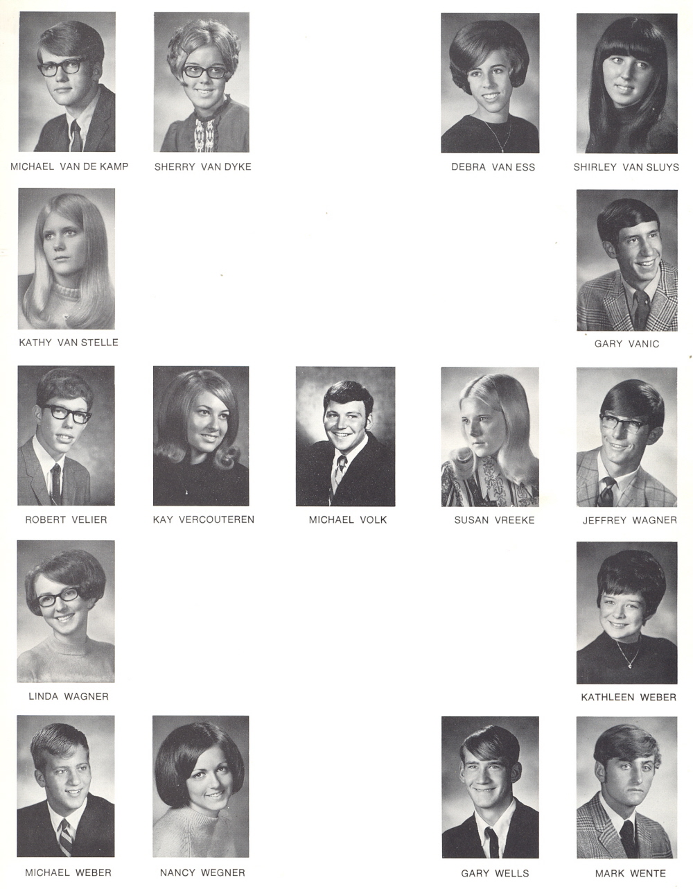 High School, Page 55: Michael Van De Kamp, Sherry Van Dyke, Debra Van Ess, Shirley Van Sluys, Kathy Van Stelle, Gary Vanic, Robert Velier, Kay Vercouteren, Michael Volk, Susan Vreeke, Jeffrey Wagner, Linda Wagner, Kathleen Weber, Michael Weber Nancy Wegner, Gary Wells, Mark Wente.