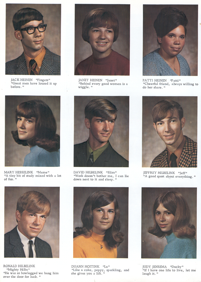 1971 Oostburg High School, Page 22: Jack Heinen, Janet Heinen, Patti Heinen, Mary Hesselink, David Hilbelink, Jeffrey Hilbelink, Ronald Hilbelink, Duann Hoitink, Judy Jensema.