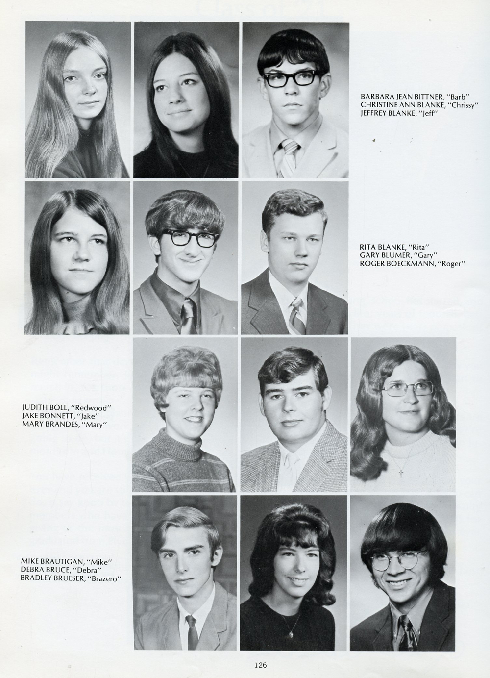 1971 Plymouth High School, Page 126: Barbara Jean Bittner, Christine Ann Blanke, Jeffrey Blanke, Rita Blanke, Gary Blumer, Roger Boeckmann, Judith Boll, Jake Bonnett, Mary Brandes, Mike Brautigan, Debra Bruce, Bradley Brueser.