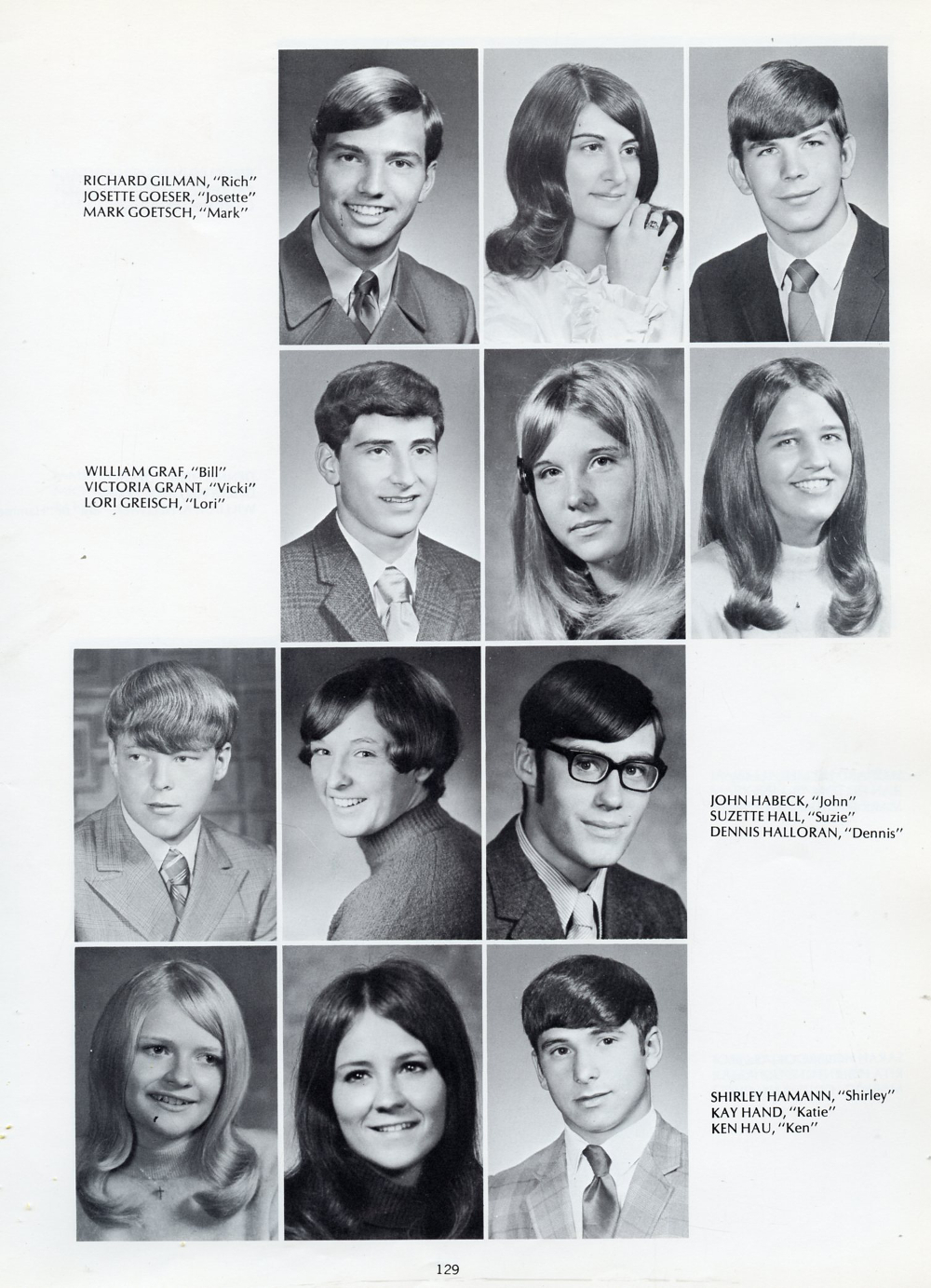 1971 Plymouth High School, Page 129: Richard Gillman, Josette Goeser, Mark Goetsch, William Graf, Victoria Grant, Lori Greisch, John Habeck, Suzette Hall, Dennis Halloran, Shirley Hamann, Kay Hand, Ken Hau.