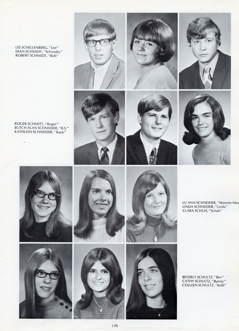 1971 Plymouth High School, Page 139: Lee Schellenberg, Dian Schmidt, Robert Schmidt, Roger Schmitt, Butch Alan Schneider, Kathleen Schneider, Lu Ann Schneider, Linda Schneider, Clara Schuh, Beverly Schultz, Cathy Schultz, Colleen Schultz.