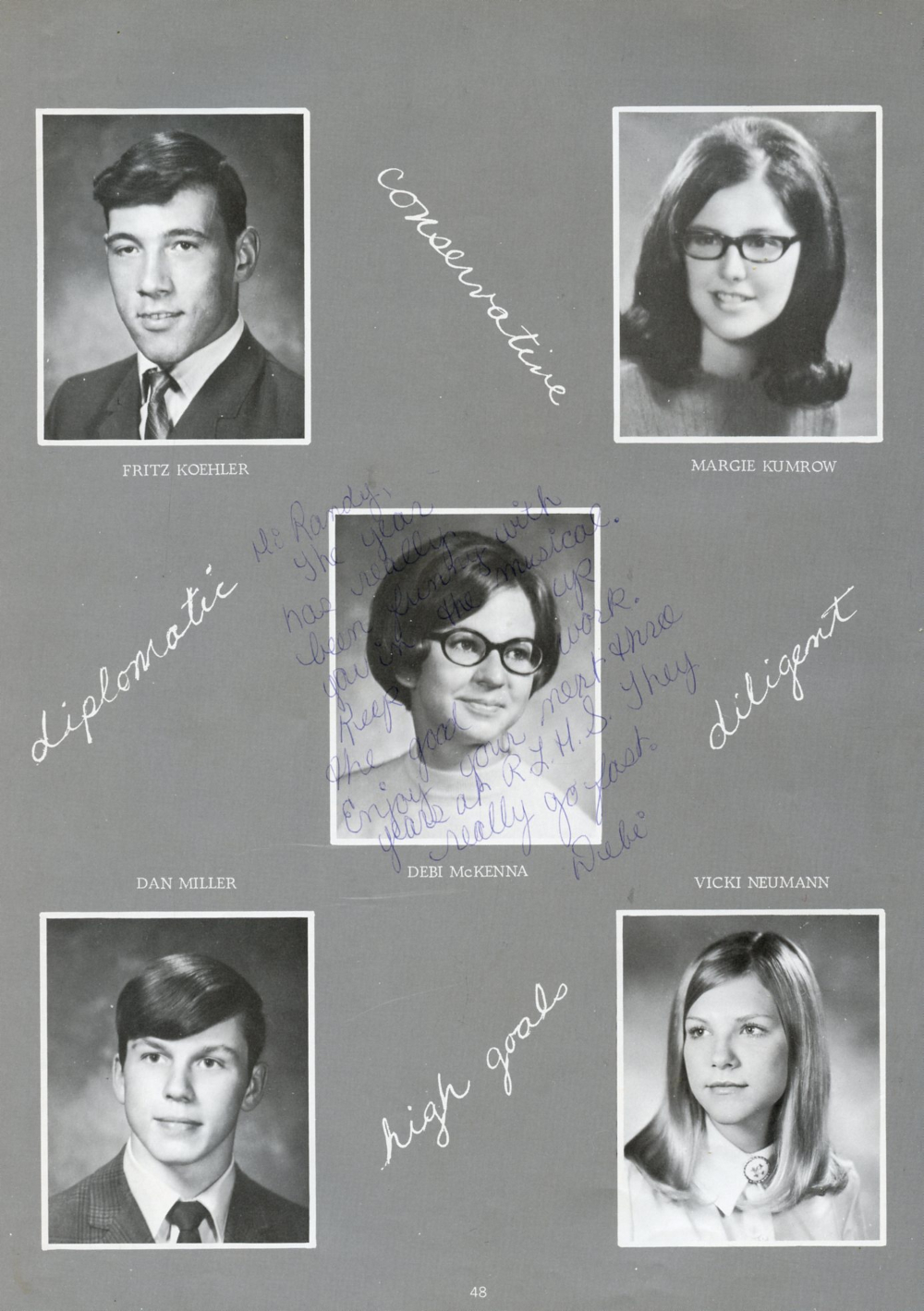 1971 Random Lake High School Yearbook Page 48: Fritz Koehler, Margie Kumrow, Debi McKenna, Dan Miller, Vicki Neumann.