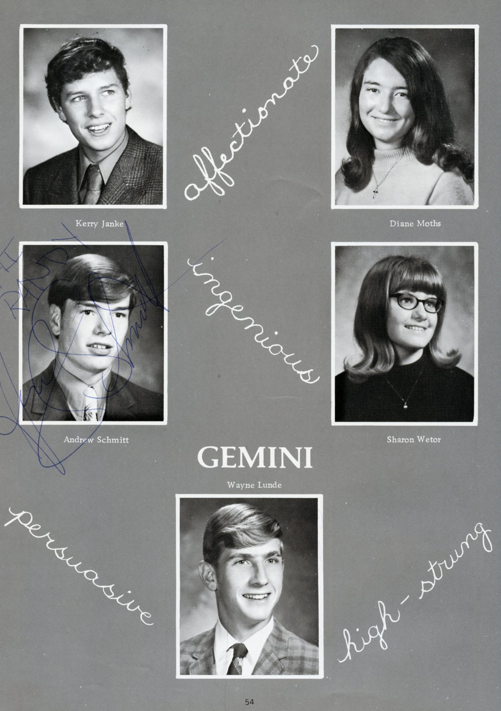 1971 Random Lake High School Yearbook Page 54: Kerry Janke, Diane Moths, Andrew Schmitt, Sharon Wetor, Wayne Lunde.