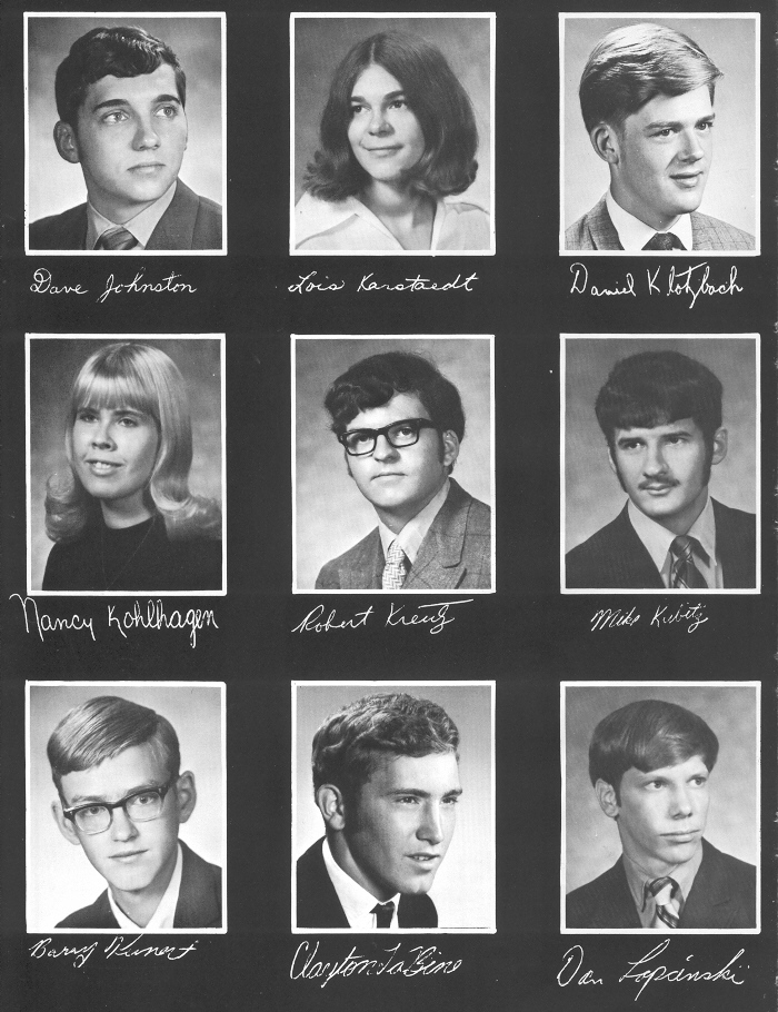 1971 Sheboygan Falls High School, Page 124: David Johnston, Lois Karstaedt, Daniel Klotzbach, Nancy Kohlhagen, Robert Kreutz, Michael Kubitz, Barry Kunert, Clayton La Bine, Dan Lapcinski.
