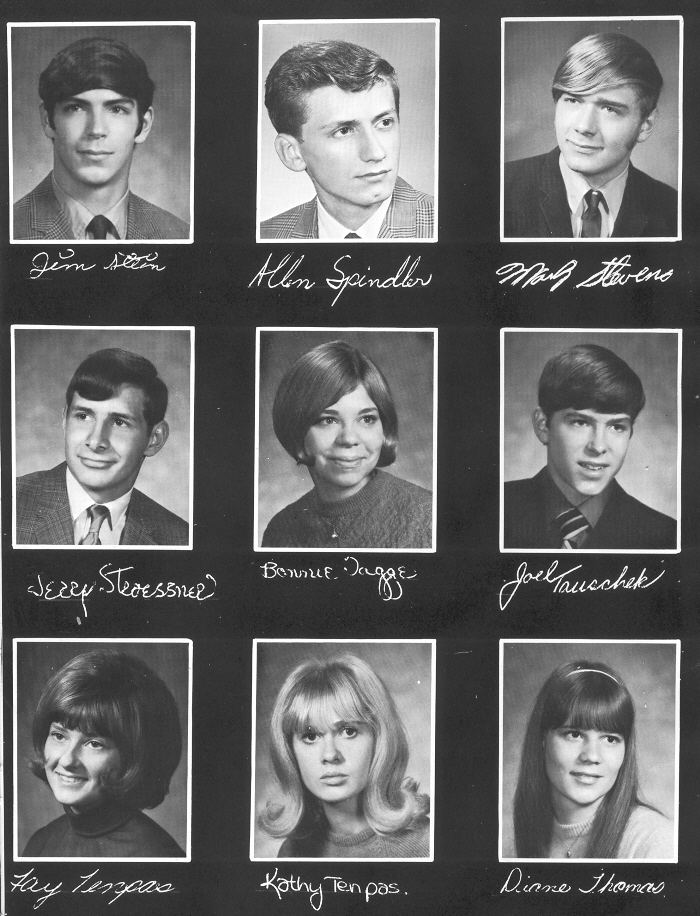1971 Sheboygan Falls High School, Page 131: Allen Spindler, James Stein, Mark Stevens, Jerry Stroessner, Bonnie Tagge, Joel Tauschek, Fay Tenpas, Kathleen Tenpas, Diane Thomas.