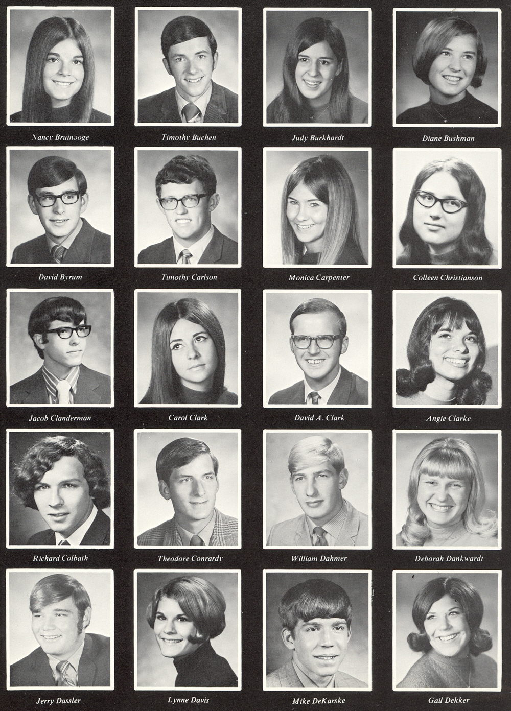 High School, Pages 120 & 141: Nancy Bruinooge, Timothy Buchen, Judy Burkhardt, Diane Bushman, David Byrum, Timothy Carlson, Monica Carpenter, Colleen Christianson, Jacob Clanderman, Carol Clark, David A. Clark, Angie Clarke, Richard Colbath, Thoedore Conrardy, William Dahmer, Deborah Dankwardt, Jerry Dassler, Lynne Davis, Mike DeKarske, Gail Dekker.
